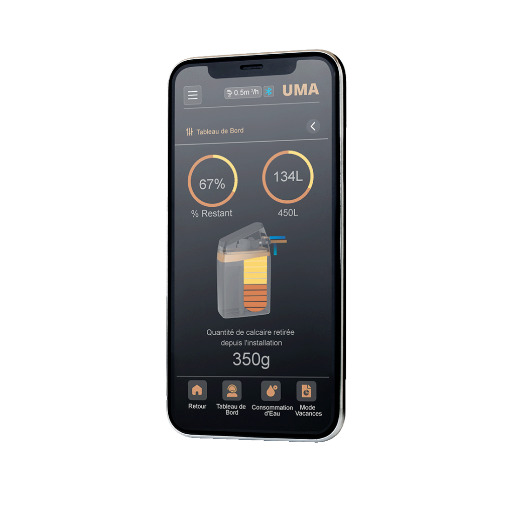 Follow-up on your water consumption and manage your softener from a distance with your Bluetooth application ‘UMA’. Download, log in and access all your water data. The app will be available in the App Store and the Play Store.